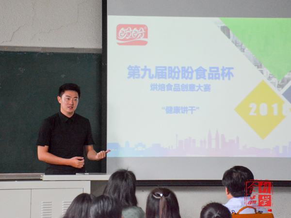 盼盼集团品牌经理郭昊天在宣讲环节先为大家展示了盼盼集团宣传片,让大家有盼盼集团有了进一步的了解。强调了举办盼盼杯的目的是致力于提高同学们实践与创新的能力,促进团队协作。本届盼盼杯的目标产品是健康饼干,提议参赛同学重点关注研究制作韧性饼干与酥性饼干,它们可塑性较高,且制作工艺较为简单,适合入门的员工制作。希望同学们发挥创意,做出更加营养、更有价值的饼干。为了调动大家的积极性,宣讲人不断与同学互动问答,并赠送盼盼牌食品作为奖励。