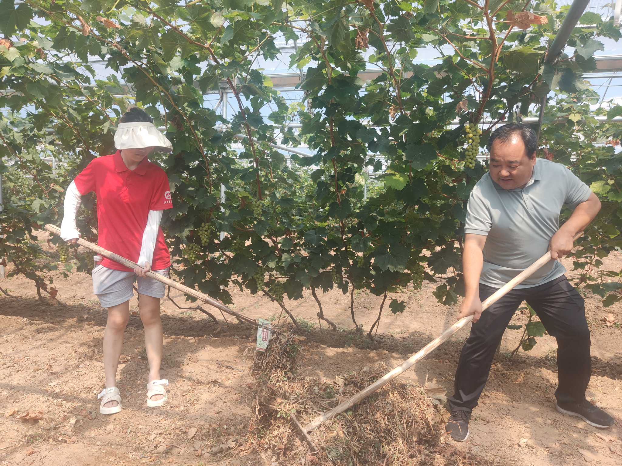 根据物候,实践团一行选择在当地葡萄成熟采收的农忙时节再赴夹河村,与农民同吃同住同劳动。在王孝国等人的示范下,实践团成员拿起锄头、拎起篮筐,在帮助农户耙地除草、采收葡萄、打包装箱、售卖发货的过程中,切身体验劳动的艰辛,调研葡萄种植全流程,查摆生产难点、痛点,了解农民所需,以期找到行之有效的科技助农之策,真正服务三农。