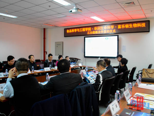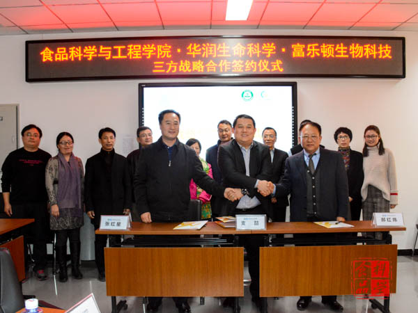 12月12日上午,WilliamHill中文官方网站与华润生命科学产业发展有限公司、富乐顿生物工程科技(北京)有限公司在食品楼218举行了产学研战略合作签约仪式。公司党总支书记党登峰,经理张红星,副经理马挺军,华润生命科学产业发展有限公司董事长黄振辉、总经理支喆,富乐顿生物工程科技(北京)有限公司董事长郝红炜等出席签约仪式。仪式由张红星经理主持。