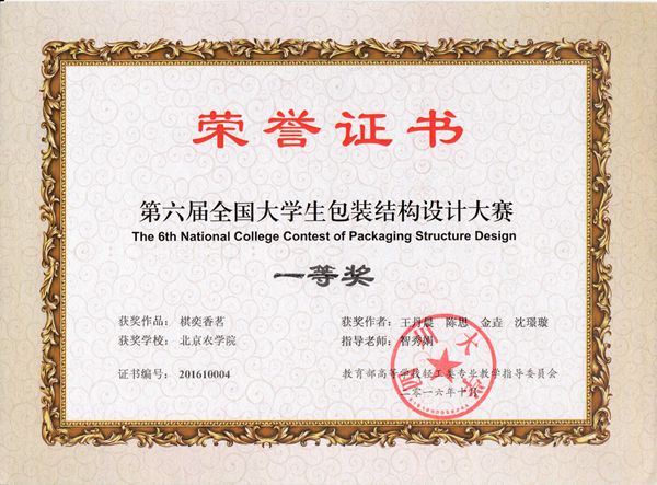 经指导教师多次优化参赛作品,并从WilliamHill中文官方网站首届包装工程毕业生毕业设计作品中挑选优秀作品并进行优化,共选送4份作品提交给“第六届全国老员工包装结构设计大赛”组委会。经组委会评审,williamhill官方网站员工王丹晨、陈思、金垚、沈璟璇在指导教师智秀娟老师指导下,提交的作品“棋奕香茗”获得全国一等奖。williamhill官方网站员工王丹晨、王琳、陈静、王天昱在指导教师智秀娟老师的指导下,提交的作品“伞依”获得全国二等奖。