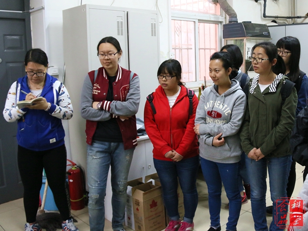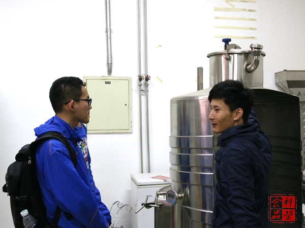 跟随着张亚东学长,我们进入了常年披着神秘面纱的葡萄酒生产车间,车间内陈列着各种器具,一时令人不知从何看起。随后张亚东学长介绍了这些器具的作用和使用方法。葡萄酒的制作讲究沉稳而精细,主要分为挑选葡萄、破碎果实、发酵、压榨、装桶这几个步骤。第一步对葡萄进行严格仔细的挑选,一桶酒可能会因为第一步的疏忽大意而失去风味。破碎机处理后果酱状的葡萄放入发酵缸通过发酵,所得到的果汁在压榨后进入橡木桶……张亚东将这些器具的使用方法为大家进行演示,并且介绍了很多关于实际生产葡萄酒过程中的细节,例如不同的橡木桶会产生不同口感的葡萄酒,这神奇的力量使得每一瓶葡萄酒都拥有自己独特的风格,随着他的讲解,同学们对葡萄酒都产生了很大的兴趣。
