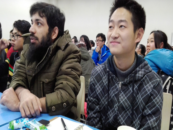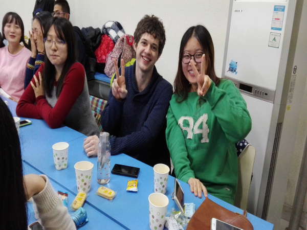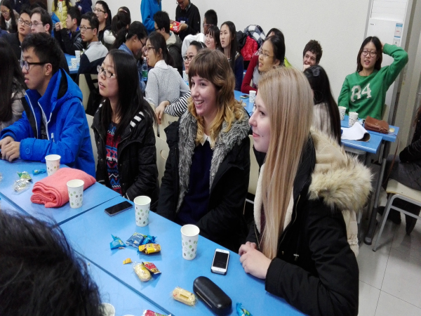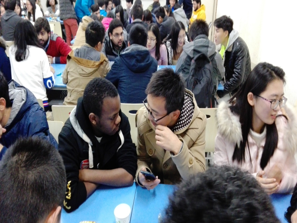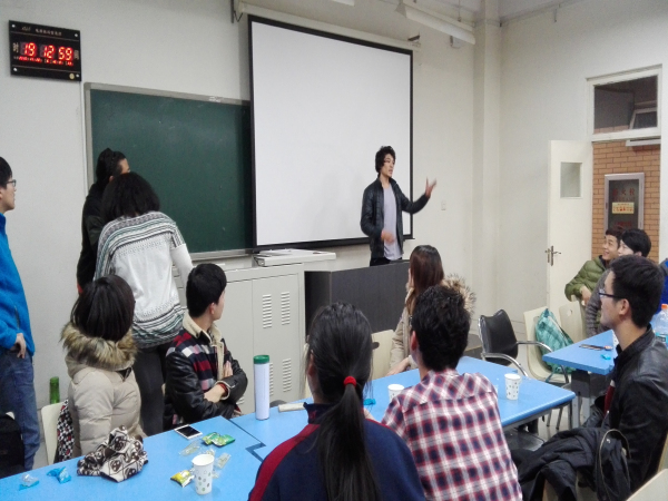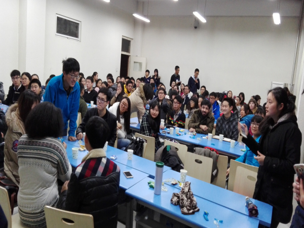 到场的同学出乎意料的多,教室里座无虚席。大家的热情也都很高,交流畅快。六点半正式开始,首先由公司马子泓同学为大家介绍中国的特色菜品及制作方法,ppt上色泽艳丽的图片吸引着大家的眼球。简单介绍了一番之后,大家开始自由交谈,聊天的内容很广泛。随后进行了猜单词,读绕口令等游戏,气氛十分活跃。在聊天过程中,主办方还给大家发了小零食,聊的也很尽兴,吃的也很尽兴。