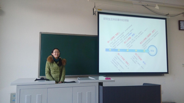 接下来计算机与信息工程公司的田鹤师兄与新生们交流了让论文顺利发表的经验和他平时保持充沛精力的作息时间。最后一位汇报嘉宾是文法公司的朱雅迪师姐,她介绍了研究生生活和学习的经验,向同学们提供了建议和意见。