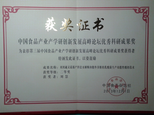 在此次论坛的科研成果发布会上,与会者品尝了刘慧教授的科研成果“降胆固醇酸奶”。该产品以其独特浓郁的酯香风味,口感黏稠、细腻和柔滑,甜酸度适中,后酸化缓慢,以及4℃冷藏21天后益生菌活菌数量仍可达到106CFU/g以上等优良特点,深受与会知名专家学者们(如国家杰出青年科学基金获得者、“长江学者”张和平教授,中国畜产品加工常务理事、“龙江学者”孔保华教授,中国食品学会乳酸菌分会常务理事、中国食品药品监督总局保健食品评审专家张兰威教授等)的一致好评。