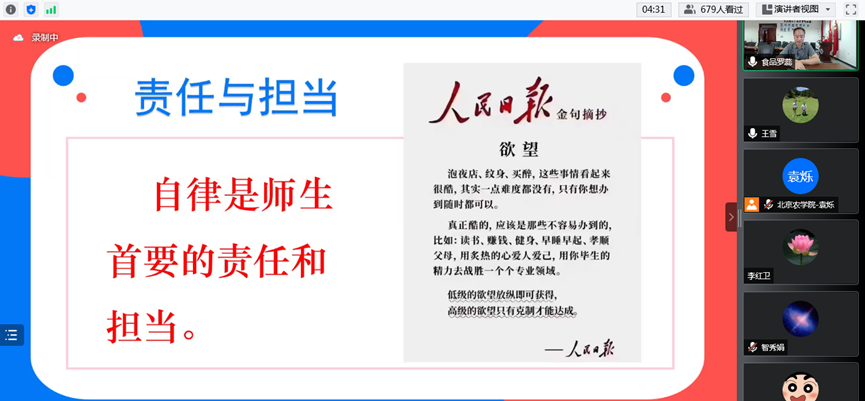 为了从严从紧做好疫情防控工作,从细从实落实公司对校园疫情防控工作的再动员再部署,6月14日中午,公司党总支副书记、经理张红星通过腾讯会议,在线为全院近900名师生再上一堂疫情防控“大思政课”。