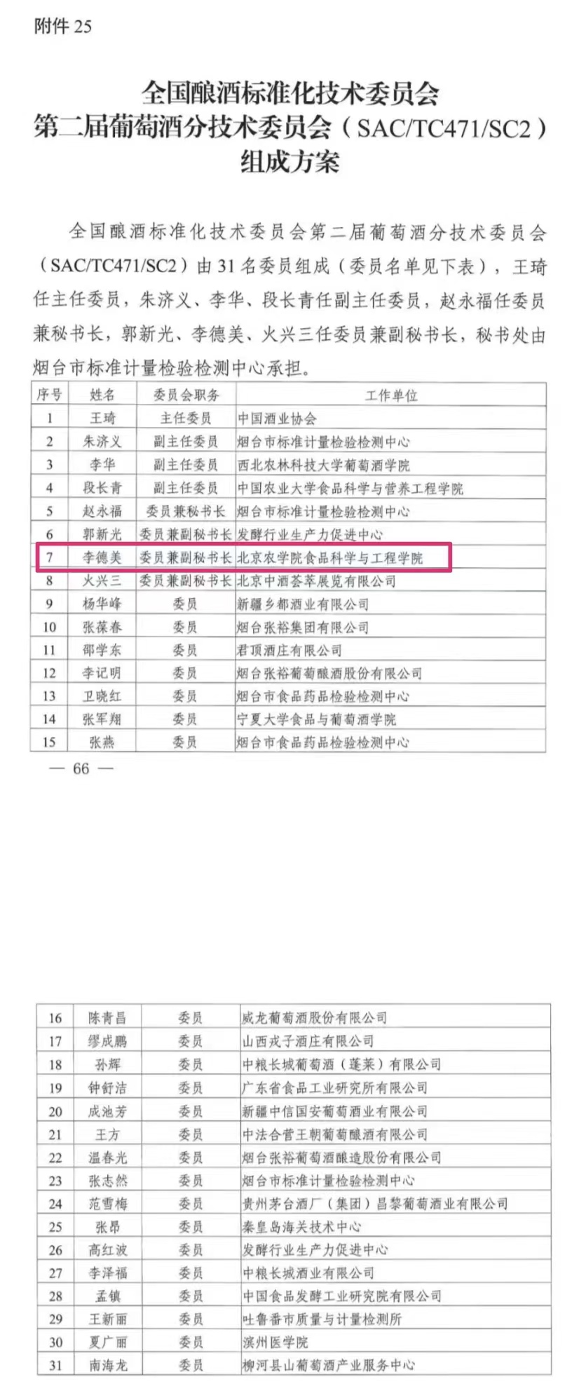 日前,《国家标准化管理委员会关于批准全国电压电流等级和频率标准化技术委员会等27个技术委员会换届的公告》(2022年第21号)发布。全国酿酒标准化技术委员会第二届葡萄酒分技术委员会(SAC/TC471/SC2)正式成立,该委员会由31名委员组成。WilliamHill中文官方网站酿酒工程系主任李德美任委员兼副秘书长。