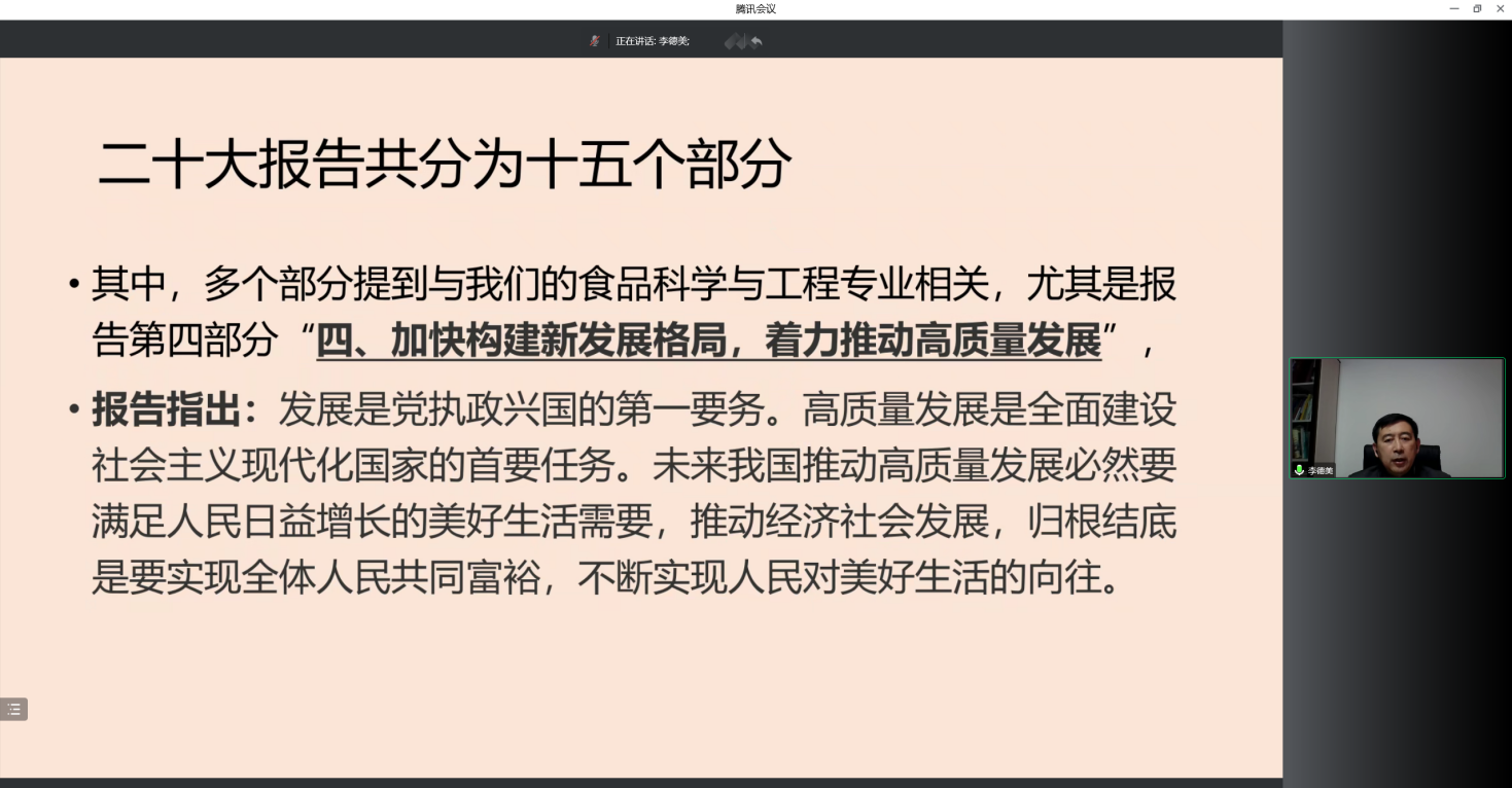 集团学习贯彻党的二十大精神宣讲团成员、酿酒工程系主任李德美作题为“立足本职,精修专业,为推进乡村振兴立新功”主题宣讲。李德美指出,党的二十大报告就“加快构建新发展格局,着力推动高质量发展”作出重要部署。他立足自身多年从事葡萄与葡萄酒工程领域教学、科研与社会服务经历,从服务葡萄酒产业发展,助力国家粮食供应安全、乡村振兴、推进兴边富民稳边固边、推进高水平对外开放和“一带一路”国家战略五个方面进行重点讲解。