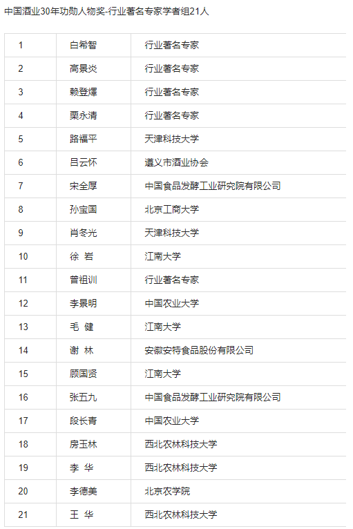 中国酒业30年功勋人物奖获得者共131名,其中行业著名专家学者21名,行业突出贡献领导人63名、科技带头人23名、行业组织管理模范24名。