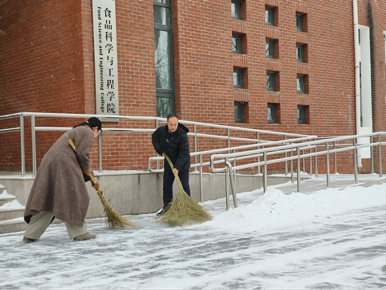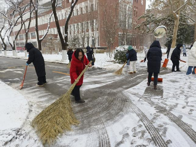 大雪之后的天气十分寒冷,却丝毫没有挡住老师和员工们劳动的热情,师生们积极主动,不畏严寒,纷纷拿着铁锹、铲子、扫帚等清雪工具积极投入清雪工作中去:扫积雪、铲冰层、清杂物、除路障,大家相互配合、齐心协力,你铲我扫,呈现出一派热火朝天的景象。