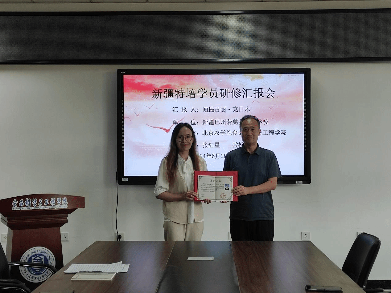 导师张红星为学员颁发结业证书。与会人员对学员帕提古丽·克日木顺利圆满完成进修学习表示热烈的祝贺。希望她搭建好公司、公司的联络渠道,在人才培养、科学研究、社会服务等多领域建立长效合作机制。