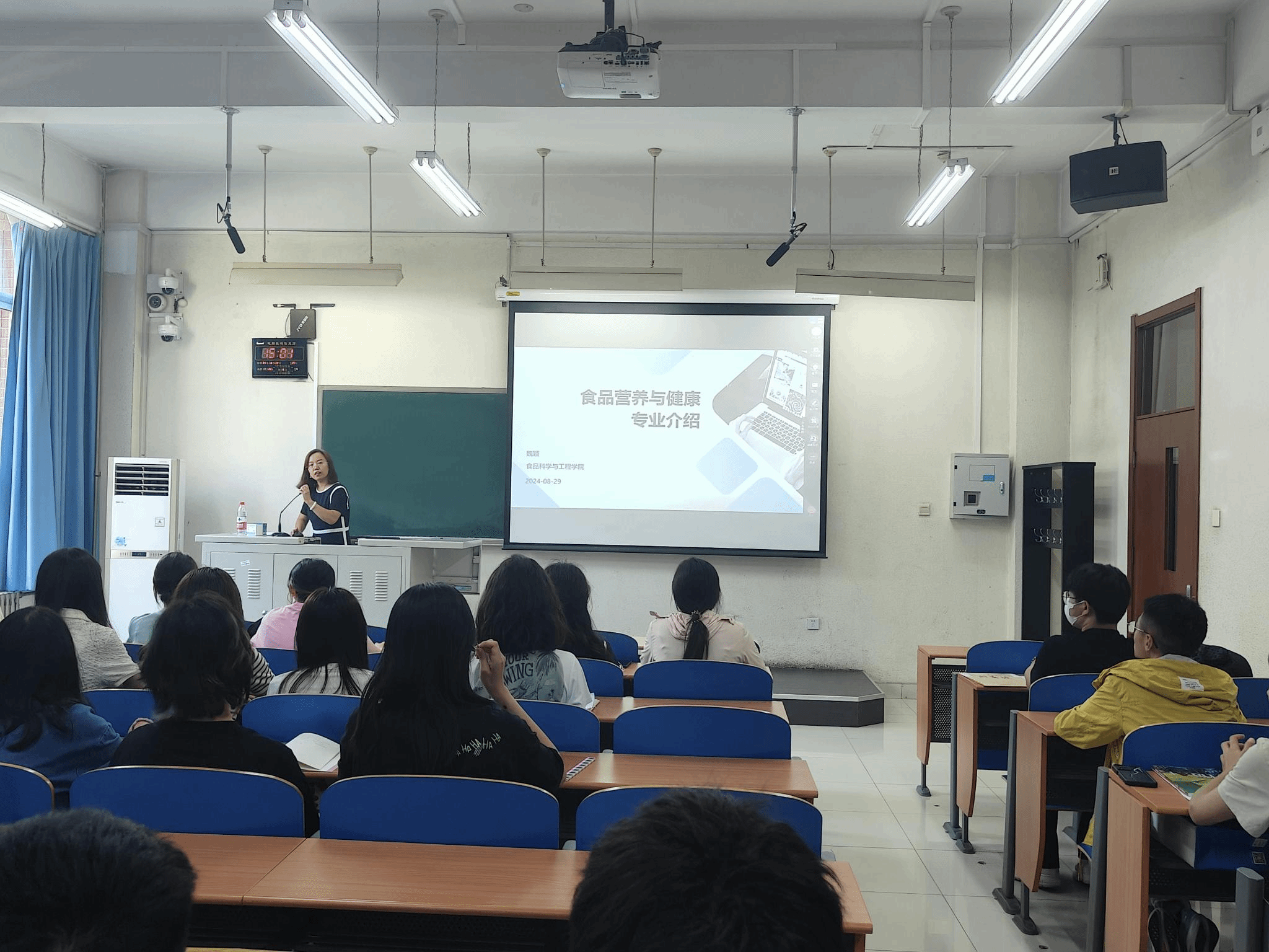 魏颖对培养方案进行详细解读,介绍了食品营养学从单一的营养学研究到跨学科综合发展的历程,重点讲解专业基础课、专业核心课、专业实践课、专业选修课等四种专业类课程设置的目的、主要教学内容以及课程知识体系之间的衔接关系。魏颖在介绍专业课程教学内容的同时还向新生们传授了一些与营养学、健康管理、疾病预防与营养干预有关的科普知识,并结合食品营养与健康领域的科研创新与学术发展动态,为同学们指出了该专业广阔的就业和发展前景。最后就新生们存在的困惑和问题进行了耐心地解答。同学们在宣讲结束之后表现出了对该专业今后学习生活的期待和向往,对四年本科期间的学习内容有了较清晰的认识和了解。