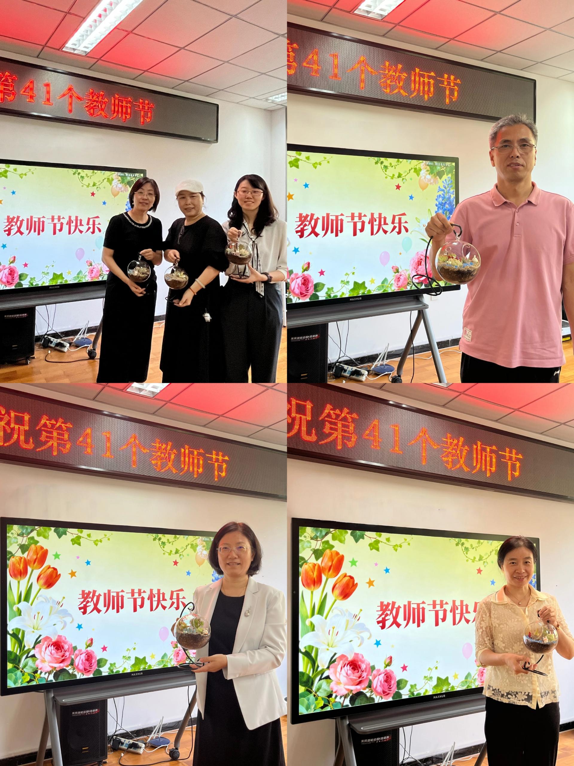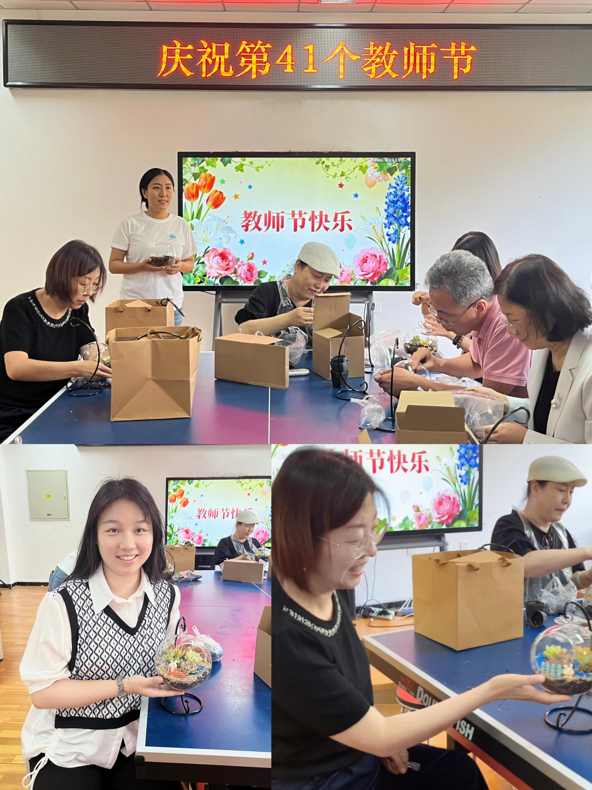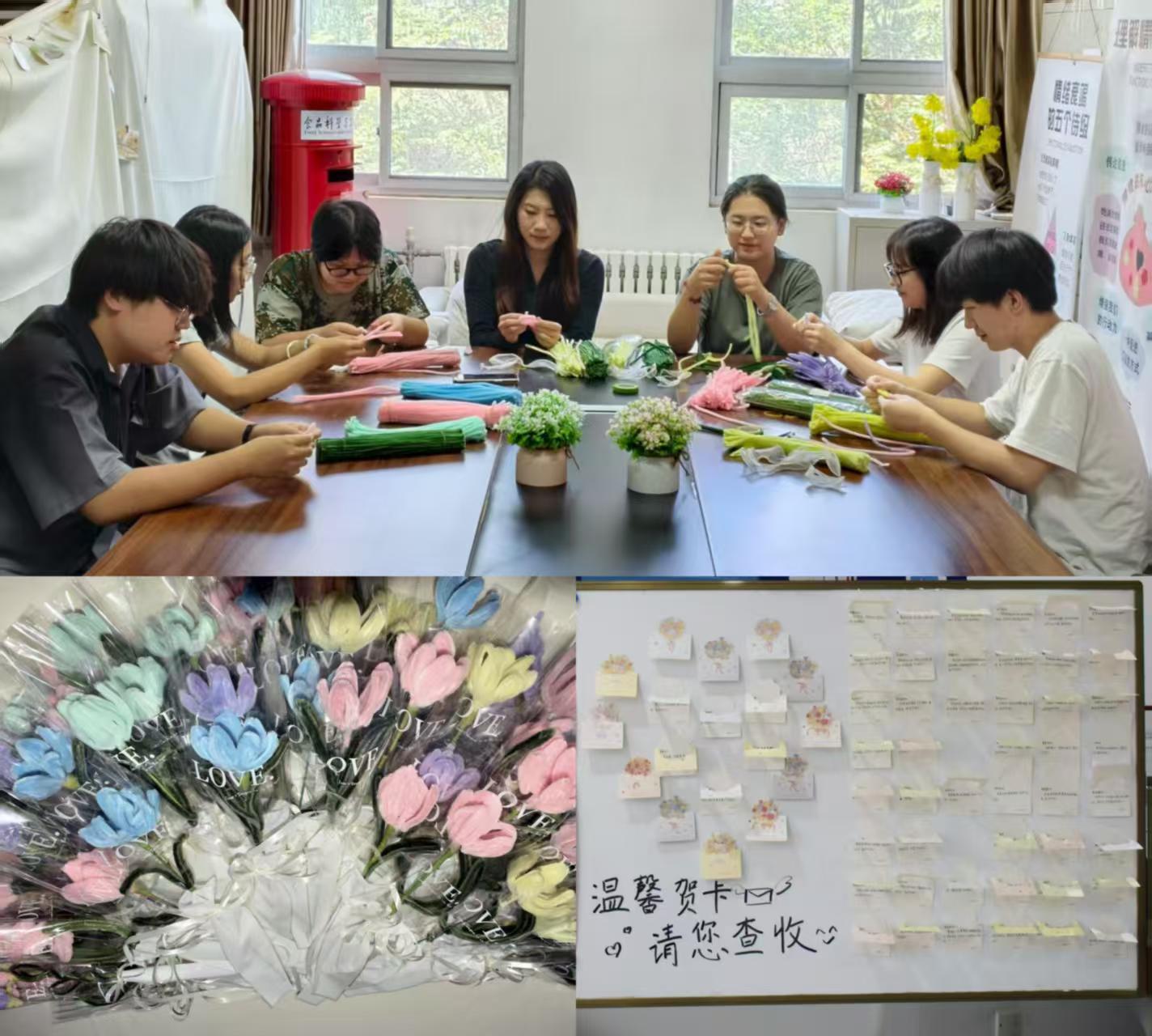 公司学子亲手制作手工花,祝福墙上贴满了温馨贺卡。教师节当天,老师们惊喜地领取DIY花束和专属贺卡,在花香与祝福中感受节日的温暖与喜悦。