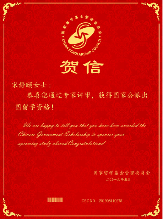 公司食品科学专业硕士研究生宋静颐同学,于近日喜获国家公派出国留学资格,即将赴荷兰瓦赫宁根大学攻读博士学位,她继2018年刘静媛同学获国家公派出国留学资格之后再次为公司增光添彩。