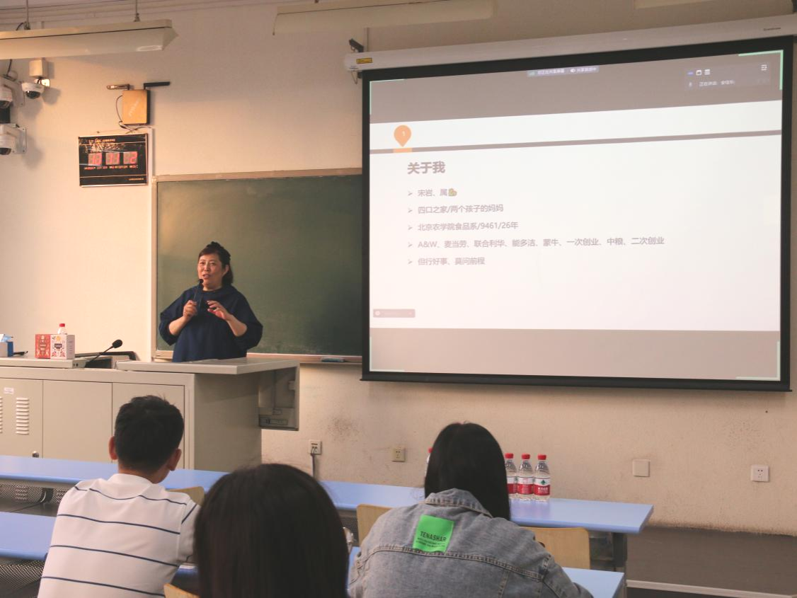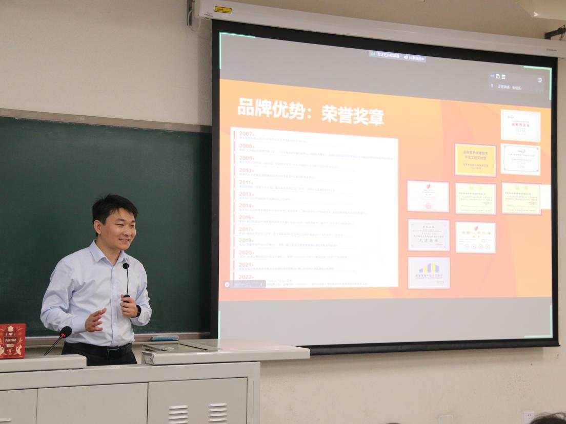北京食益食品有限公司是一家侧重分析消费者需求和消费行为模式,为餐饮客户和企业福利客户提供合适的产品和一站式解决方案的食品企业,目前与中粮集团、雀巢、铂天等知名企业建立上游合作伙伴关系,同时发展有丸茶日记、伊伊白勺等自有品牌。宣讲会上总经理宋岩向同学们介绍了公司背景、组织结构、合作伙伴、商业模式、招聘岗位等方面的内容。