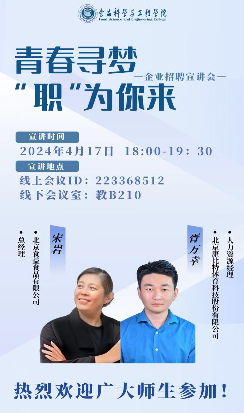 近日,公司举办“青春寻梦,‘职’为你来”企业招聘宣讲会,会议邀请北京食益食品有限公司和北京康比特体育科技股份有限公司两家企业到公司进行招聘宣讲活动。公司员工工作负责人闻海洋,辅导员官凌霄、杨丰瑞,公司毕业生通过线上、线下参加招聘宣讲会,会议由闻海洋主持。