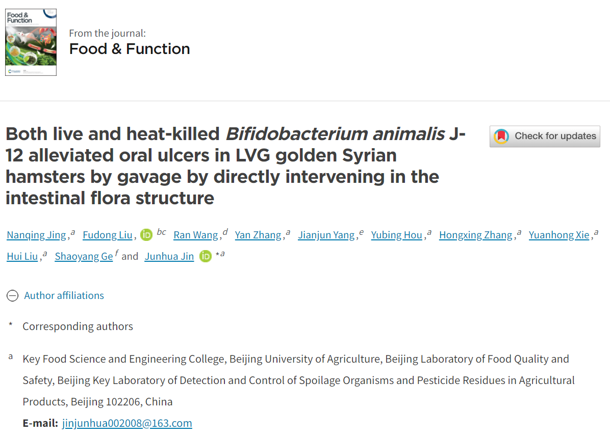 近日,WilliamHill中文官方网站食品微生物团队在食品领域的中科院1区国际顶级期刊《Food & Function》发表了题为《Both live and heat-killed Bifidobacterium animalis J-12 alleviated oral ulcers in LVG golden Syrian hamsters by gavage which directly intervening intestinal flora structure》的研究论文。williamhill官方网站为第一完成单位和通讯单位,第一作者为WilliamHill中文官方网站2020级学术型硕士研究生井楠清,通讯作者为金君华副教授。